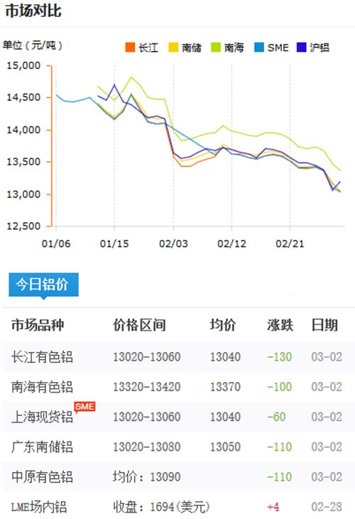 鋁錠價(jià)格今日鋁價(jià)2020-03-02